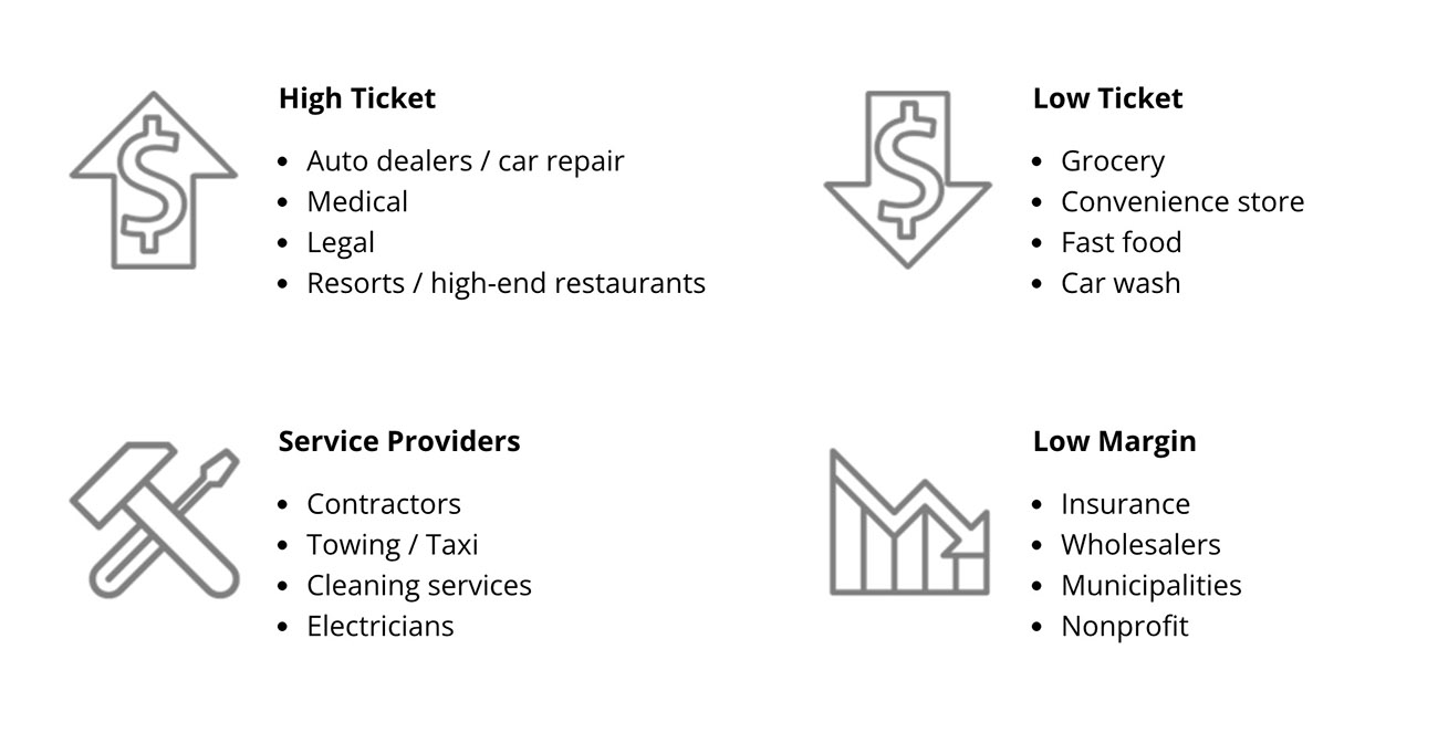 Zero-fee processing is an ideal solution for many industries where accepting credit cards is often not practical or difficult due to processing costs. Some examples include: